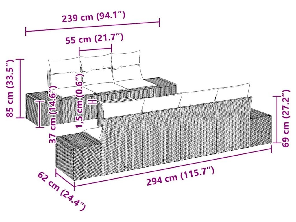 - 4 x boční pohovka: 37 x 62 x 37 cm (D x Š x V)