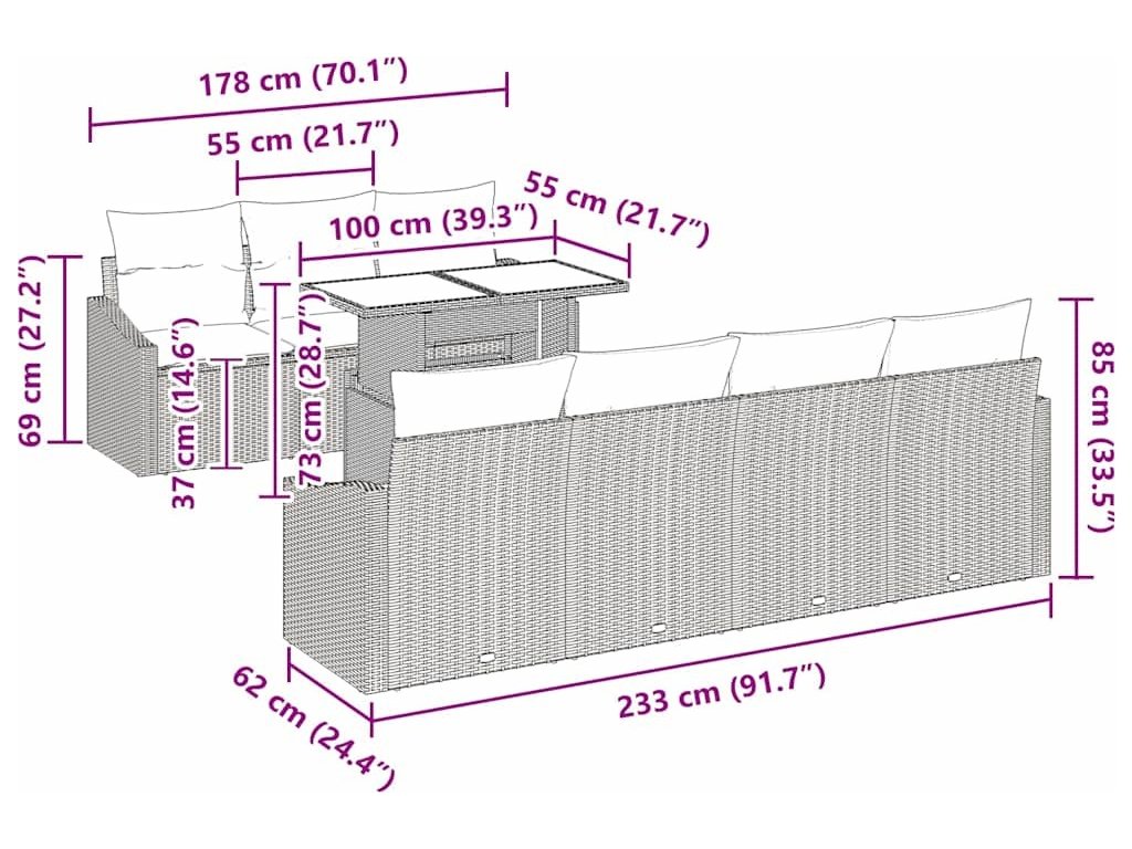 - Materiál z poly ratanu: Tato zahradní souprava je z pevného poly ratanu, který odolává špatnému počasí a UV záření. Ručně tkaná textura dodává vašemu venkovnímu prostoru styl, zatímco zaručuje dlouhou životnost napříč sezónami.