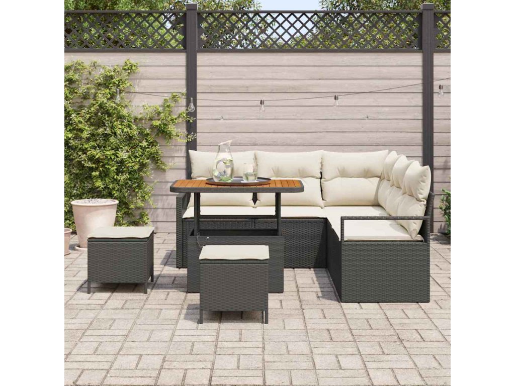 - Vysoce kvalitní materiály: Tato sedací souprava z poly ratanu nabízí stylový a odolný povrch, který vydrží venkovní počasí. Rámy z práškově lakované oceli jsou pevné a akáciové dřevo dodává celému designu elegantní nádech.