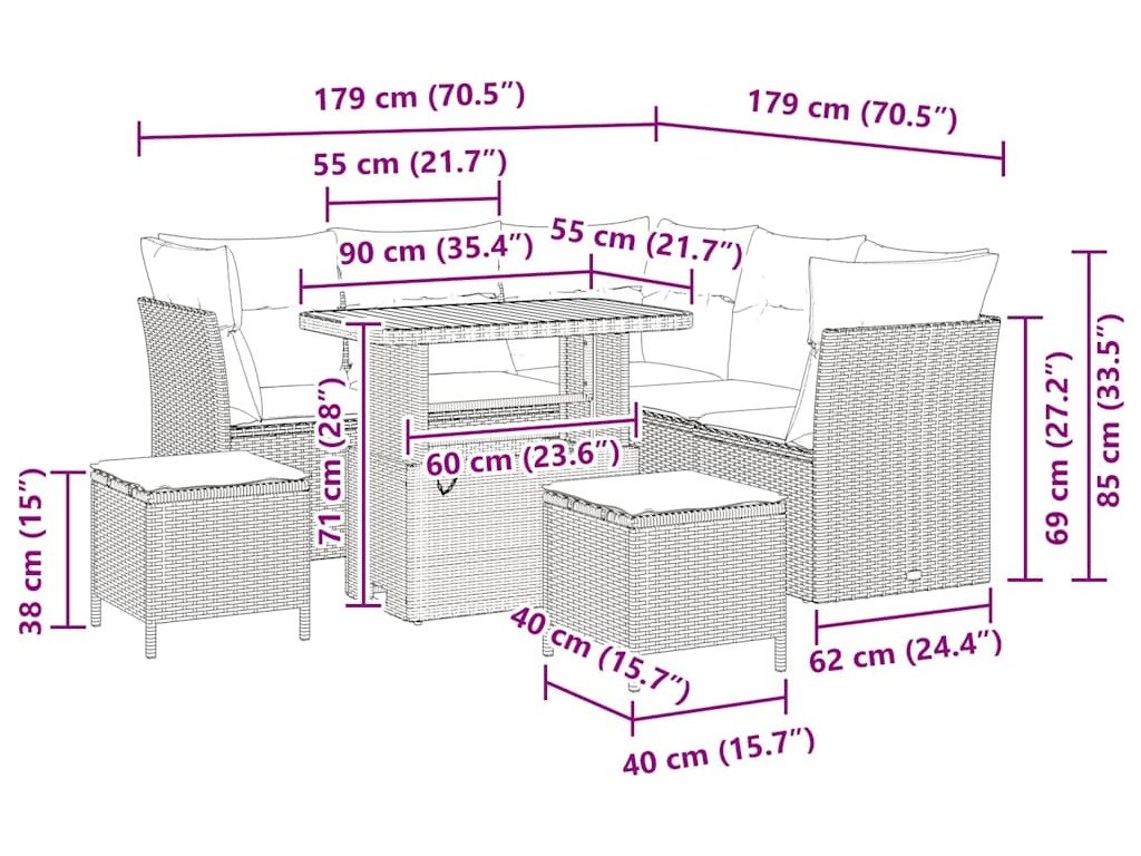 - 3 x Rohové sedadlo: 62 x 62 x 69 cm (D x Š x V)