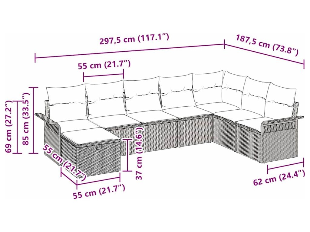 - 8 x zadní polštář: 55 x 55 cm (D x Š)