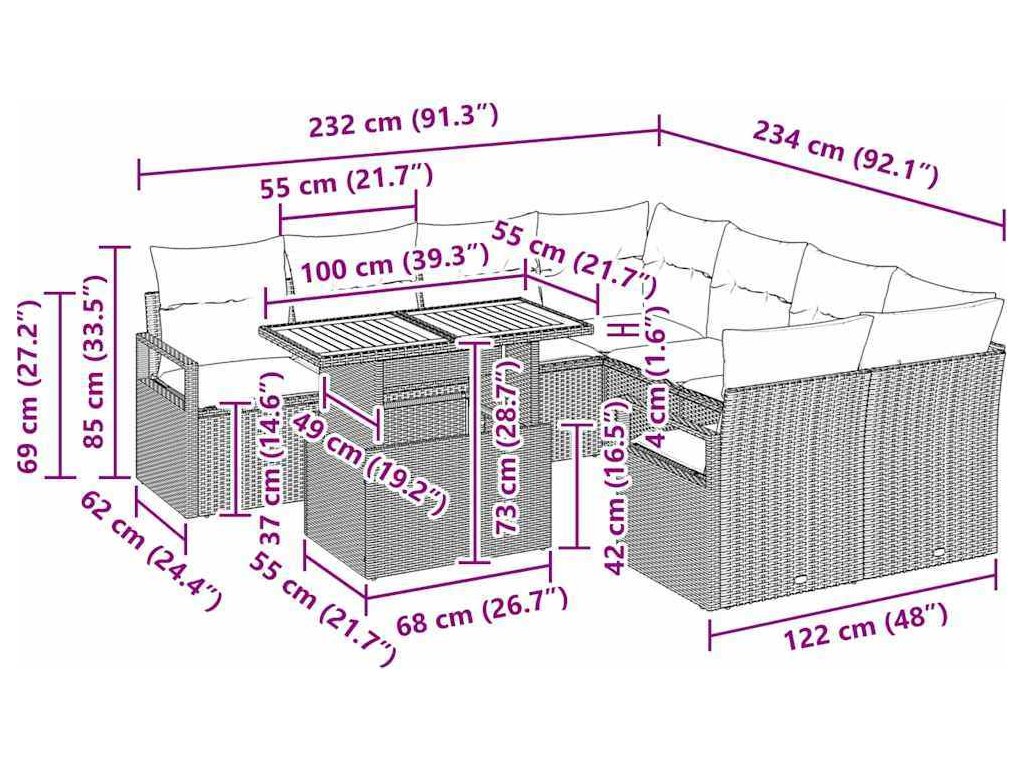 Tato sada zahradního stolování z poly ratanu dokonale spojuje moderní styl s praktičností a nabízí všestrannou možnost venkovního nábytku pro jakoukoli zahradu nebo terasu. Její elegantní, minimalistický design, charakterizovaný čistými liniemi a pevnými akáciovými dřevěnými povrchy, je funkční i vizuálně atraktivní. Modulární konfigurace soupravy ti umožní přizpůsobit tvůj prostor, což ji činí ideální pro rodinné oslavy i samostatné lenošení. Její odolné materiály zajišťují dlouhou životnost, zatímco pohodlné polštáře dodávají dotek luxusu tvému venkovnímu prostředí.