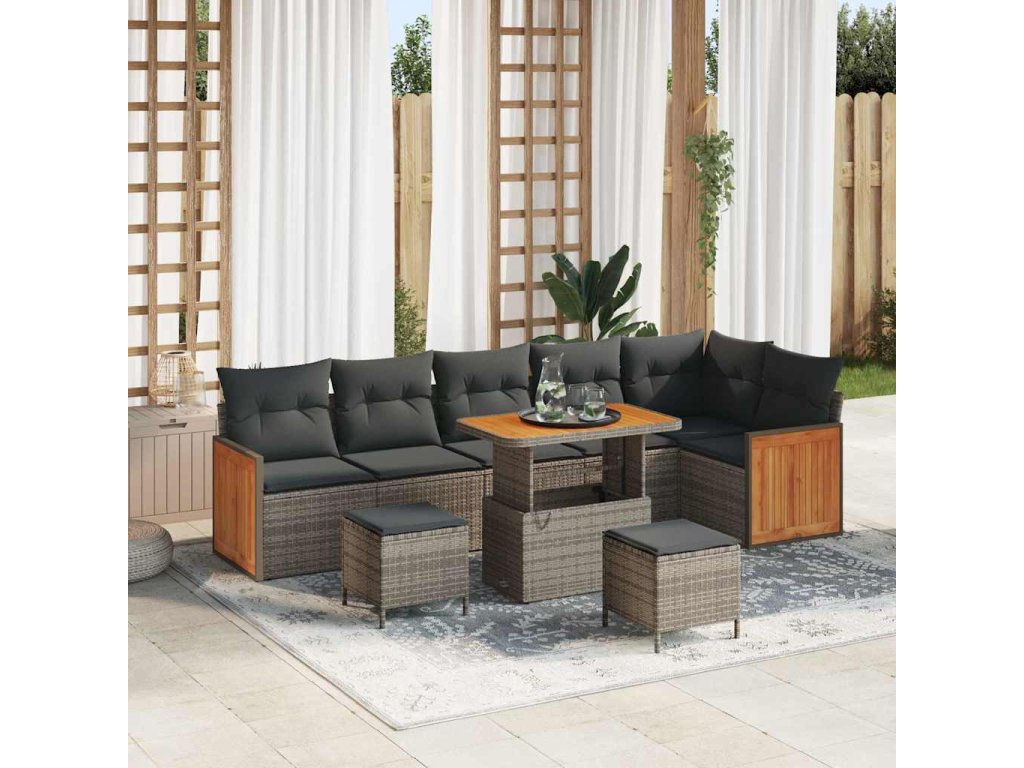 Tento moderní zahradní pohovkový set je ideální pro terasy a zahrady a spojí elegantní jednoduchost s užitečným designem. Je vyrobený s čistými liniemi a bez zbytečných ozdob, takže se parádně hodí do moderních venkovních prostor. Díky přizpůsobitelným funkcím, jako je stůl s nastavitelnou výškou, můžeš svobodně měnit mezi neformálním stolováním a pohodlným odpočinkem – je to ideální místo na setkání nebo klidné útočiště pod širým nebem.