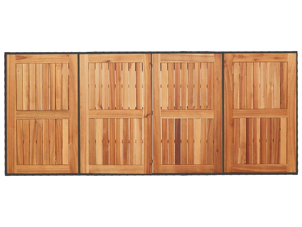- Prvky z masivního akáciového dřeva Opěrky a stůl jsou vyrobené z akáciového dřeva, co se cení pro svoji odolnost a přirozenou krásu. Tenhle materiál parádně doplňuje polyratan a dodává setu styl a pevnost, ideální pro jakékoliv venkovní uspořádání.