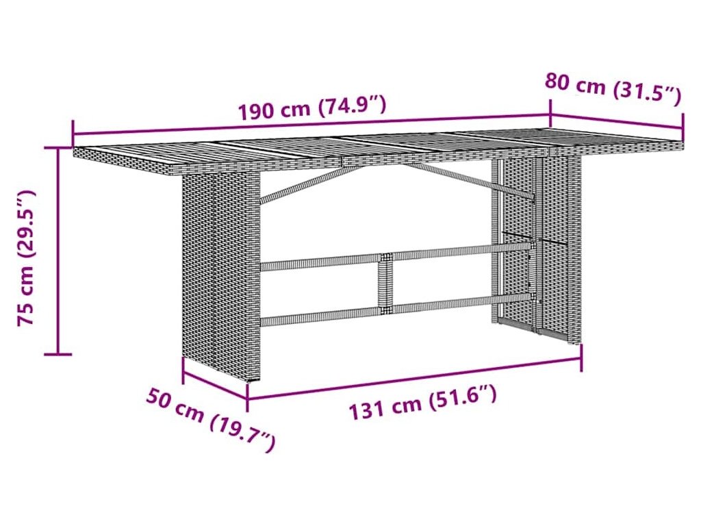 - 1 x zahradní stůl: 190 x 80 x 75 cm (D x Š x V)