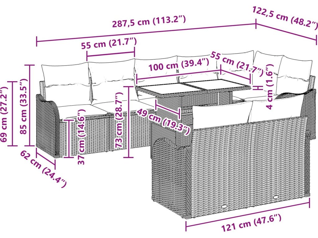- Univerzální uspořádání Modulární rozložení vám umožní jednoduchou změnu uspořádání podle potřeb, poskytující flexibilitu pro velké shromáždění nebo klidné odpoledne. Tato přizpůsobivost zaručuje, že souprava se hodí do každého venkovního prostředí.
