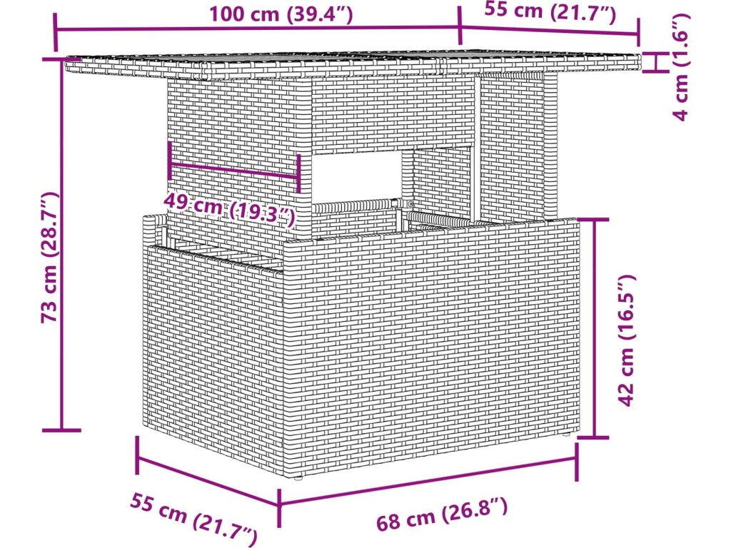 | 1 x stůl: | 100 x 55 x 73 cm (D x Š x V) |