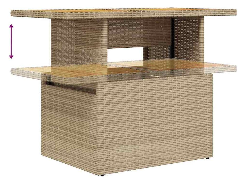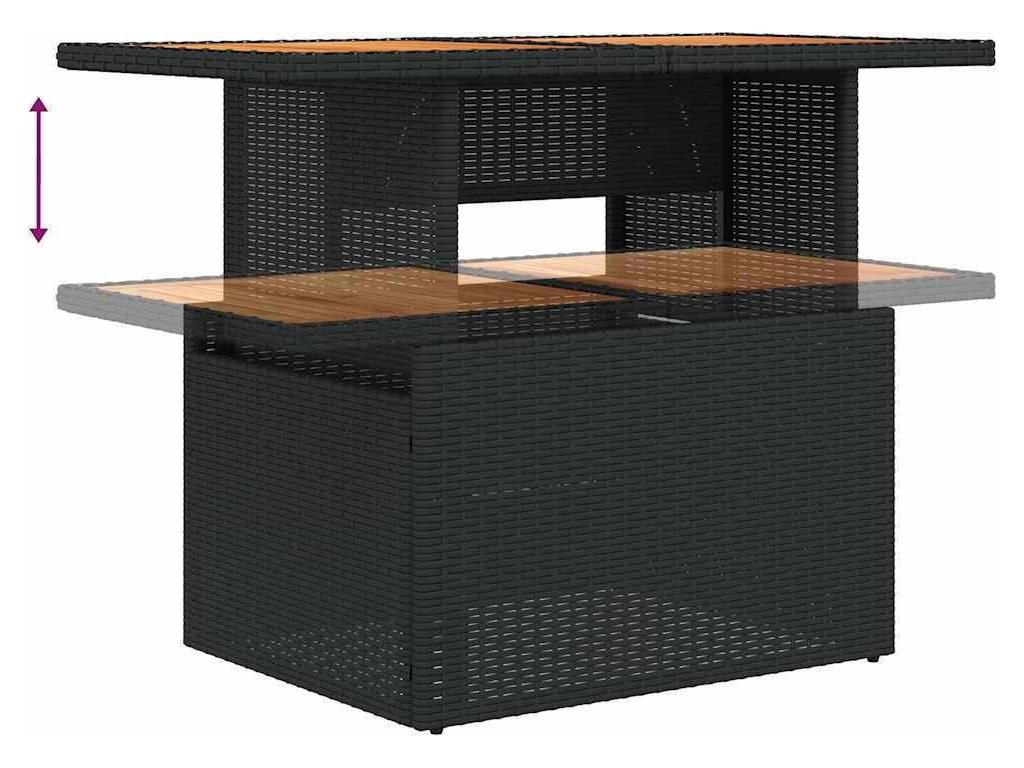 - Materiál: PE ratan, práškově lakovaná ocel, masivní akáciové dřevo s olejovou povrchovou úpravou