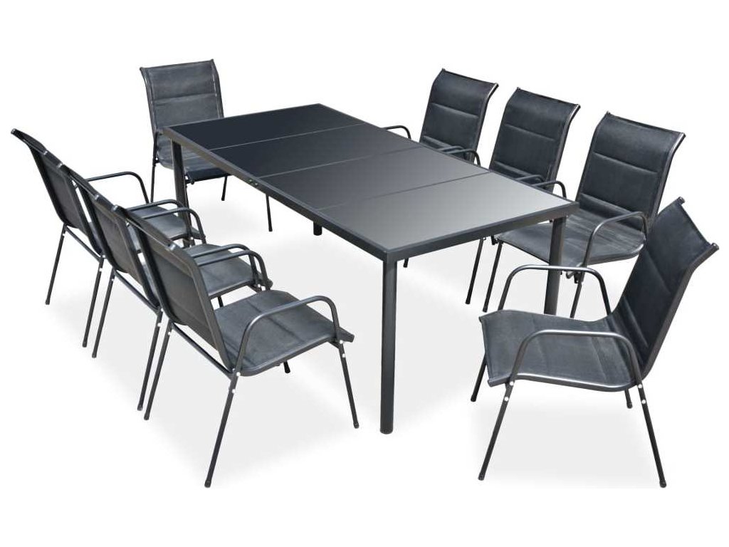 Náš jídelní set se skládá z 1 stolu se skleněnou deskou a 8 textilenových židlí. Jídelní set má stylový design a odolný ocelový rám, a proto je rozhodně perfektní volbou pro váš venkovní prostor. Jednoduchá elegance tohoto jídelního setu vytvoří z každého stolování zvláštní událost.