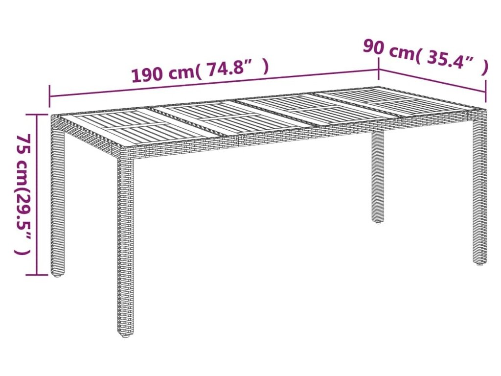 - Materiál: PE ratan, práškově lakovaná ocel, masivní akáciové dřevo s olejovou povrchovou úpravou