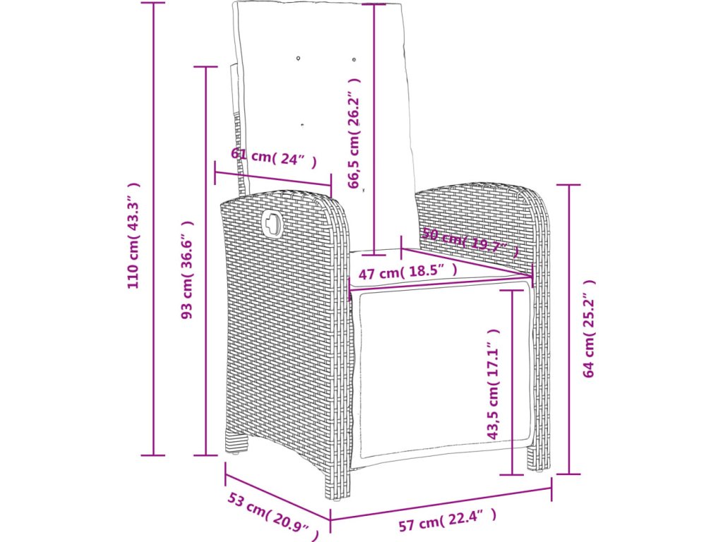 - Rozměry při poloze vsedě: 57 x 58,5 x 93 cm (Š x H x V)