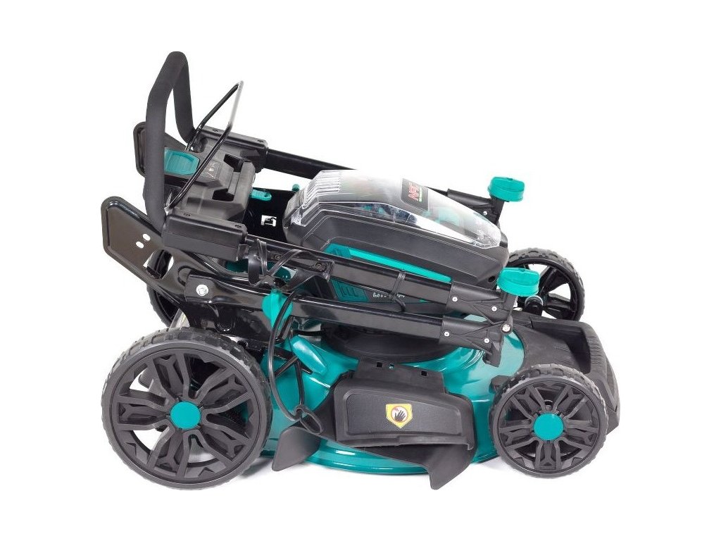 Velkou výhodou sekačky je její skladnost díky sklápěcím rukojetím. Na přední straně krytu najdete praktickou rukojeť, která vám usnadní a urychlí její zvedání nebo přenášení.