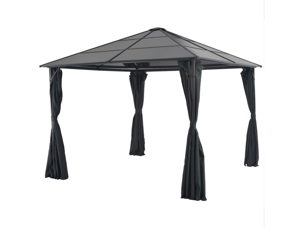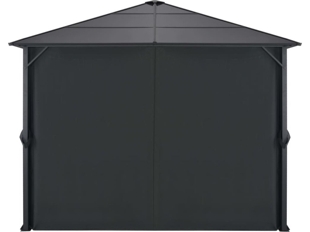 Střecha je vyrobena z 6 mm silných polykarbonátových desek a ochrání vás jak před žárem, tak i před škodlivými UV paprsky přímého slunečního záření. Altán má pevnou konstrukci z pevného hliníku a oceli, a proto nerezaví a je mimořádně stabilní. Disponuje rovněž 4 bočními stěnami, které můžete zatáhnout v případě nevlídného počasí. Pro jednoduché uvázání závěsů najdete na altánu poutka na suchý zip.