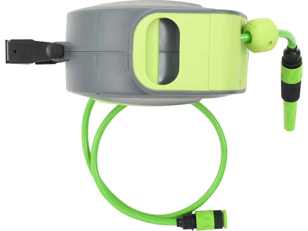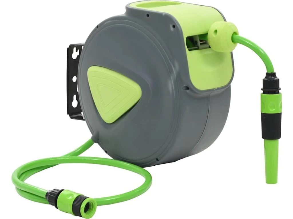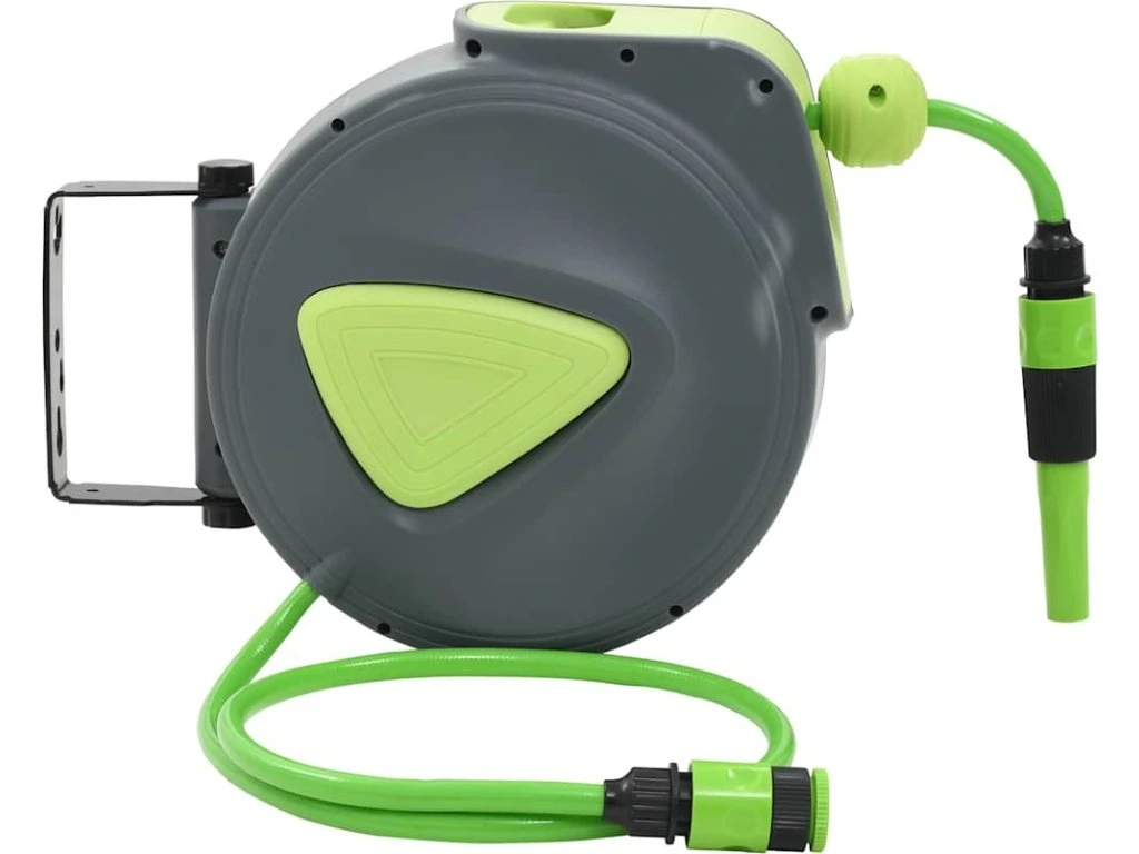 Tento vratný naviják na zahradní hadici s rozprašovačem a přípojkou můžete připevnit na stěnu a používat ho k zalévání zahradních záhonů, zavlažování trávníků, umývání aut a k dalším venkovním pracím, k nimž je zapotřebí kvalitní proud vody.