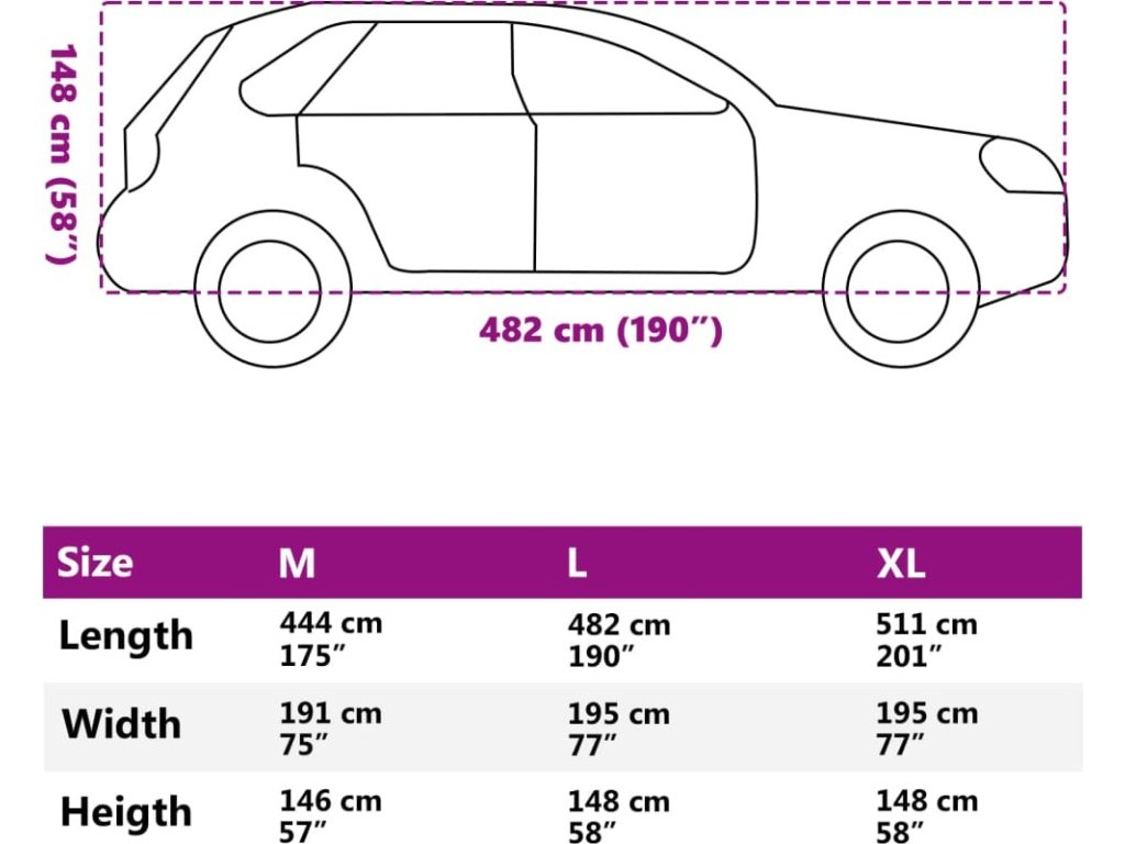 - Větruodolná konstrukce: Pružné okraje potahu zajišťují, že se dobře přizpůsobí vašemu vozu, zatímco nastavitelné popruhy s přezkami ve spodní části jej udrží na místě i ve větrných dnech.