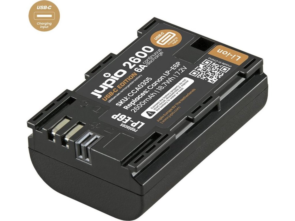 Prémiová baterie Jupio LP-E6P Ultra C je určená pro fotoaparát Canon R5 Mark II. Poskytuje kapacitu 2 600 mAh, což je o 39 % více než u originální baterie LP-E6P. Obsahuje totiž kvalitní články třídy A. Díky nepřetržitému vybíjení baterie (6 A) plně podporuje všechny funkce fotoaparátu (včetně záznamu 8K videa). Baterie je vybavená vlastním USB-C vstupem pro nabíjení.