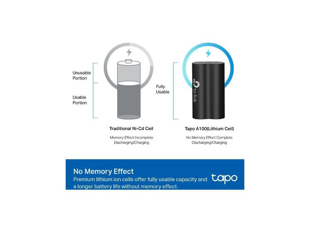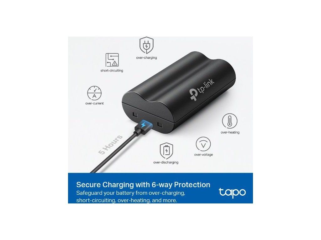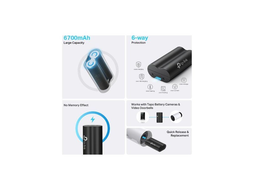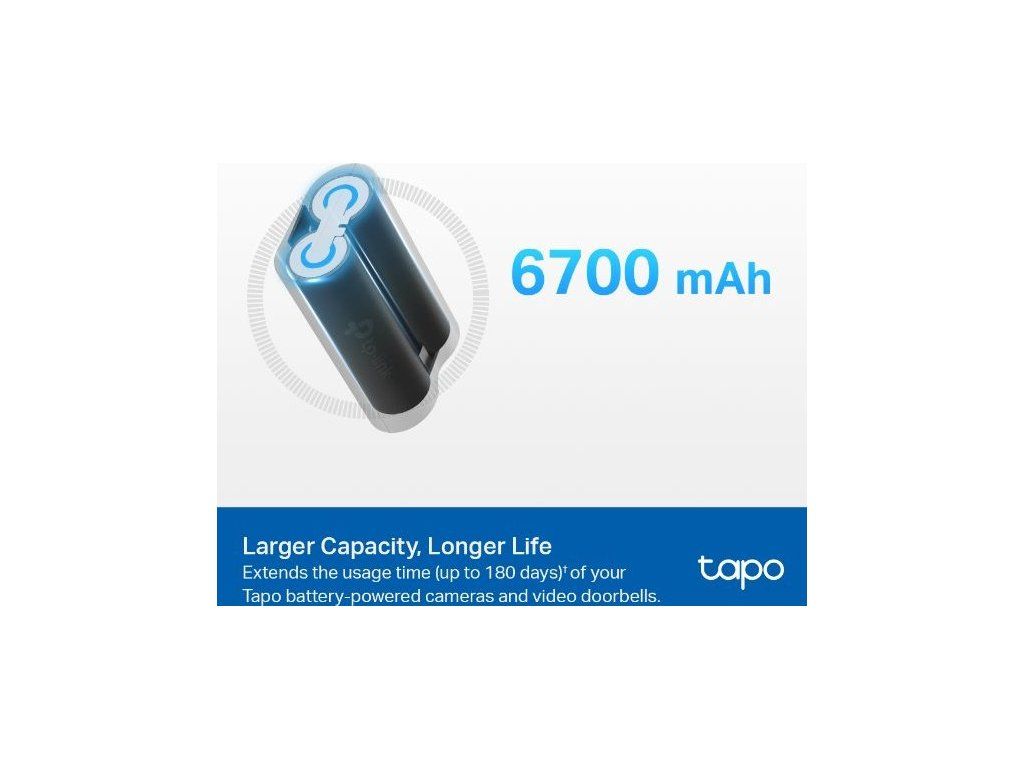 Pokud vlastníte kamery a videozvonky Tapo, jistě se vám hodí baterie TP-Link Tapo A100. Má velkou kapacitu 6 700 mAh, která prodlužuje dobu používání vašeho zařízení. Vyrábí se z prvotřídních lithium-iontových článků pro delší životnost. Instalace baterie je velmi snadná a zabere vám pouze pár minut. Kromě toho ji rychle a bezpečně nabijete. Přibližně za 5 hodin doplníte baterii energii a můžete ji používat. Navíc je chráněná proti zkratu, přebíjení, přehřátí, přepětí, nadměrnému vybíjení a nadproudu.
