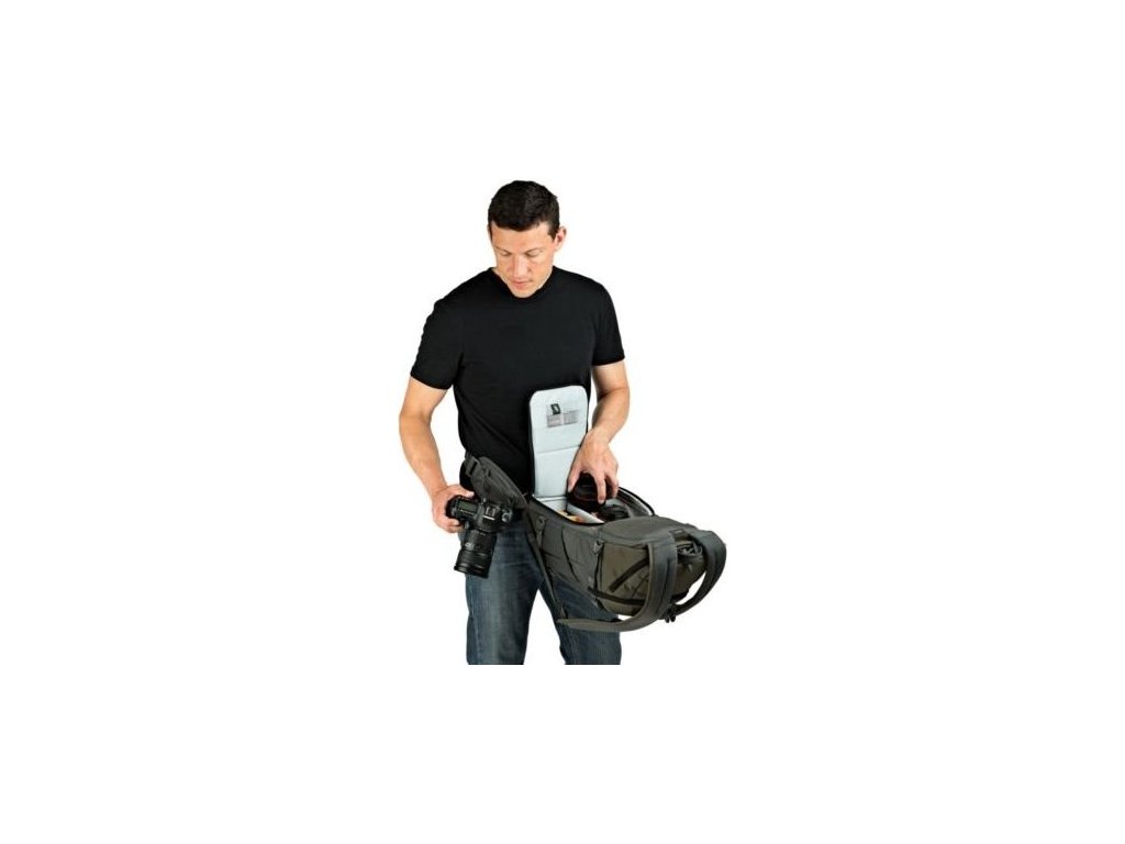 Kvůli výměně objektivu nemusíte celý batoh sundávat ze zad. Díky
