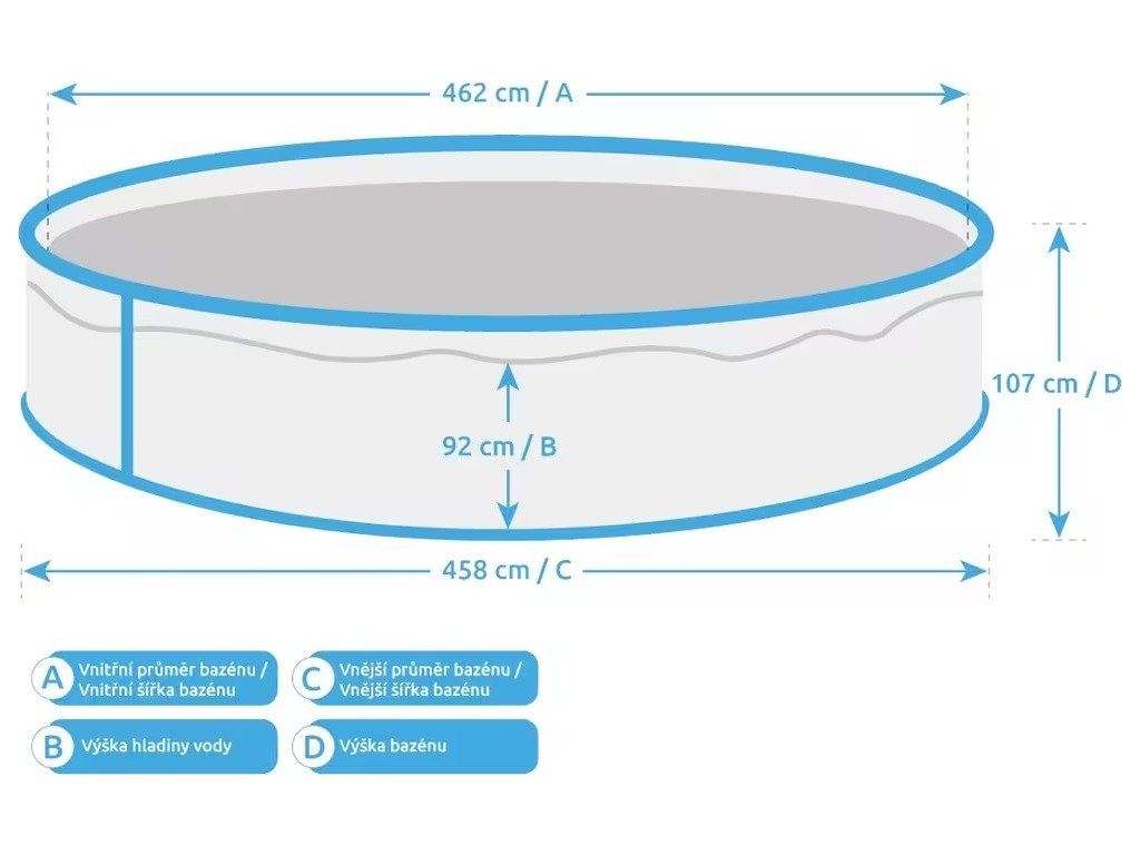 Poznámka: Ostatní bazénové příslušenství, jako jsou schůdky, podložka nebo krycí plachta, si dokoupíte zvlášť. Návod na sestavení bazénu obsahuje i příslušenství, které v balení nenajdete. Prodává se samostatně. Uvedené rozměry jsou pouze orientační. Povolená výrobní odchylka je 5 %.