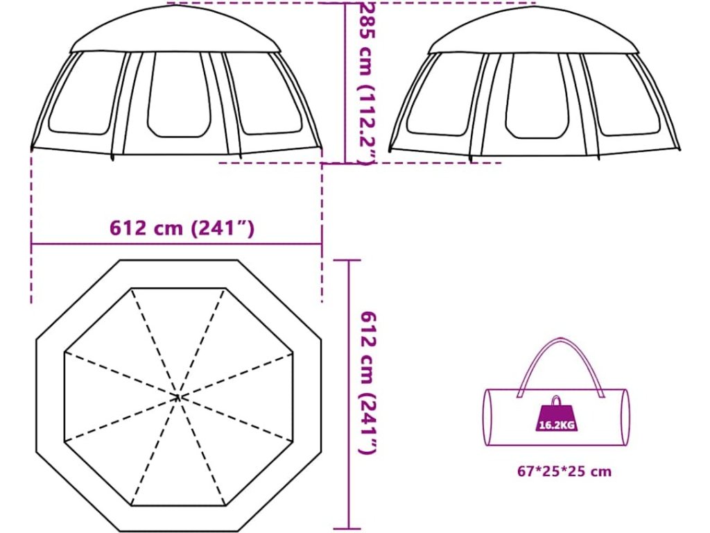 - Celkové rozměry: 612 x 612 x 285 cm (D x Š x V)