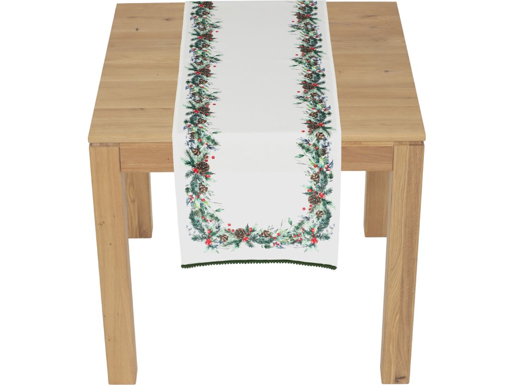 Běhoun s barevným vzorem jehličí, šišek a bobulí na čistě bílém podkladu vnese sváteční náladu na váš stůl. Vyrobený ze 100 % polyesteru o rozměru 40 × 150 cm je praktický a snadno udržovatelný – lze ho prát na 30 °C. Skvělý doplněk pro krásné a stylové prostření během vánočního období.
