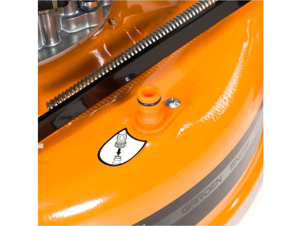 Když skončíte se sekáním, plášť a tělo můžete snadno umýt. Stačí připojit zahradní hadici do rychlospojky na plášti sekačky a sekačku spustit.