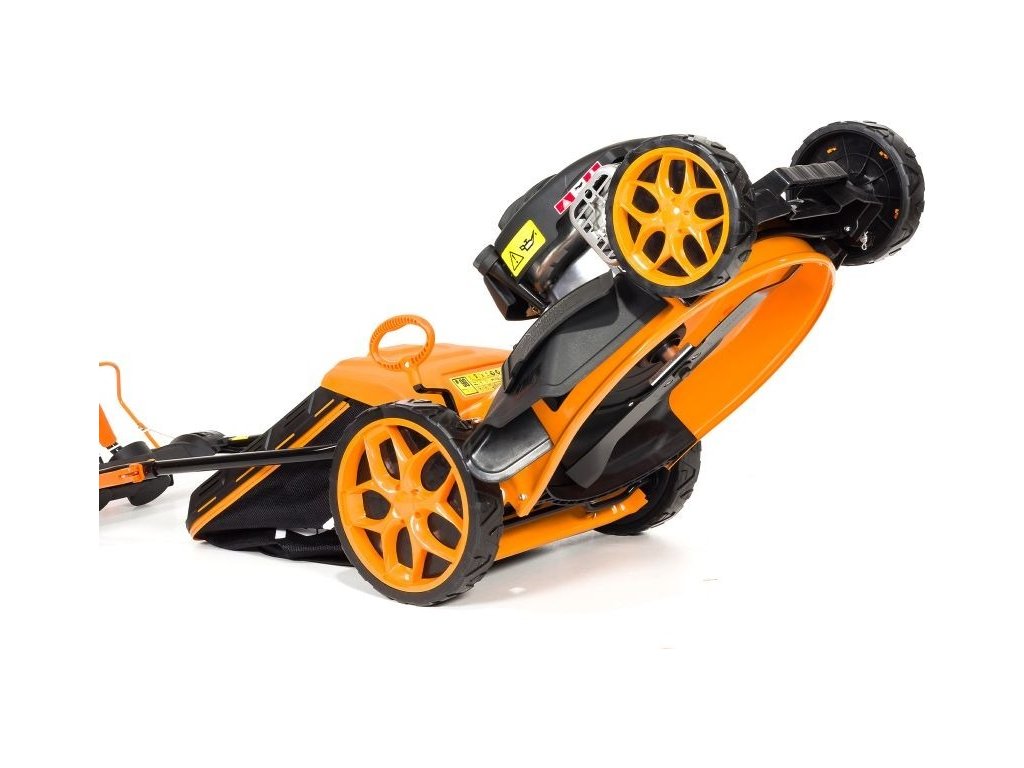 Měkčené a ergonomicky tvarované rukojeti zaručují pohodlí při práci. Pod madlem najdete šikovný držák na pití a drobné věci. Díky velkým předním i zadním kolům s kuličkovými ložisky, která snižují valivý odpor, se vám bude se sekačkou dobře manévrovat.