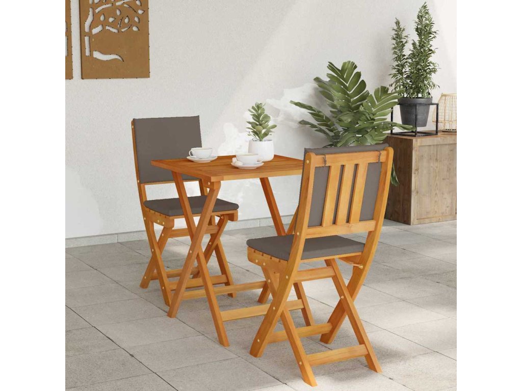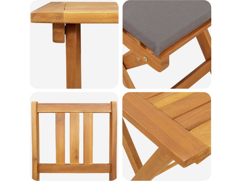 - Masivní akáciové dřevo: Tento bistro set je vyroben z masivního akáciového dřeva, které je odolné a odolává povětrnostním podmínkám. Olejovaný povrch ukazuje přírodní barvy dřeva a poskytuje ochranu proti vlhkosti. Tento materiál zaručuje, že set si svou krásu zachová i po dlouhé době, zatímco poskytuje pevné a spolehlivé sezení.