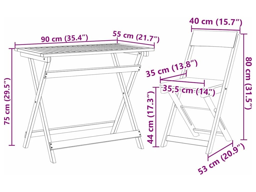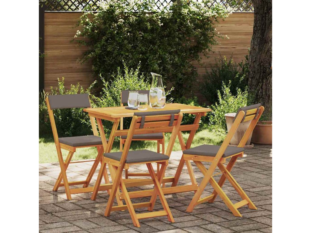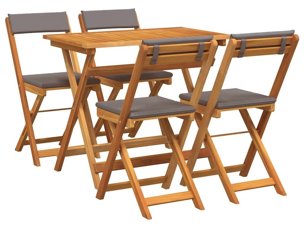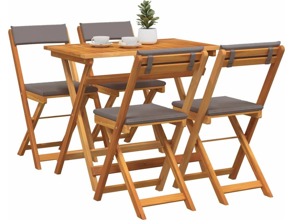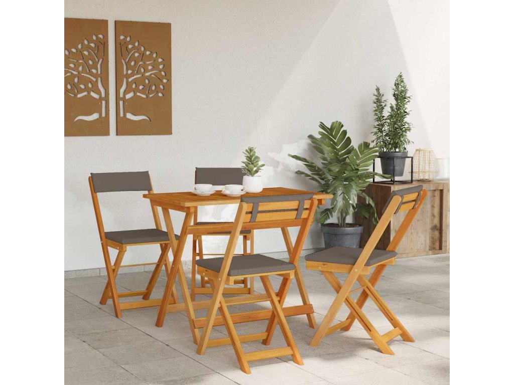 Tato skládací bistro sada je skvělým doplňkem každého venkovního prostoru, díky svému minimalistickému designu a funkcionalitě. Vyrobená z masivního akáciového dřeva, sada se skládá z pohodlného stolu a čtyř skládacích židlí — ideální pro venkovní stolování nebo lenošení na sluníčku. Skvělá pro zahrady a terasy, přírodní olejový povrch vyzdvihuje syté odstíny dřeva a poskytuje ochranu proti povětrnostním vlivům.