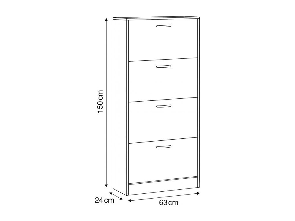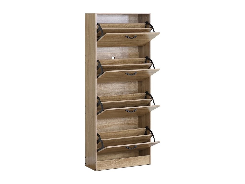 Botník s čtyřmi samostatnými přihrádkami nabízí praktické řešení pro uspořádání obuvi v předsíni či chodbě. Vyroben je z MDF desek s dekorativní povrchovou úpravou v odstínu dub, která napodobuje strukturu dřeva a snadno se udržuje. Každá přihrádka je vybavena černou úzkou úchytkou pro pohodlné otevírání. Kompaktní tvar a vertikální uspořádání šetří místo a zároveň poskytuje dostatek úložného prostoru. Botník je stabilní a navržený pro dlouhou životnost v domácím prostředí.