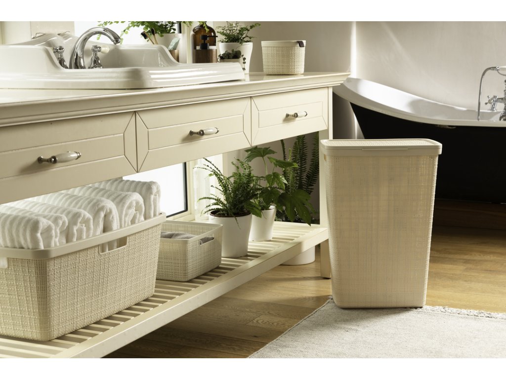 Tento stylový a praktický box se vyrábí ze 100% recyklovaného plastu. Je tedy šetrnější k životnímu prostředí. Jeho provedení připomíná tkaninu a perfektně zapadne do každého prostředí. Doplní vybavení kuchyně, obývacího pokoje, ložnice a klidně i koupelny.