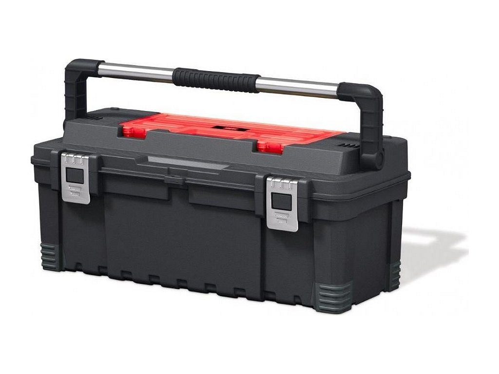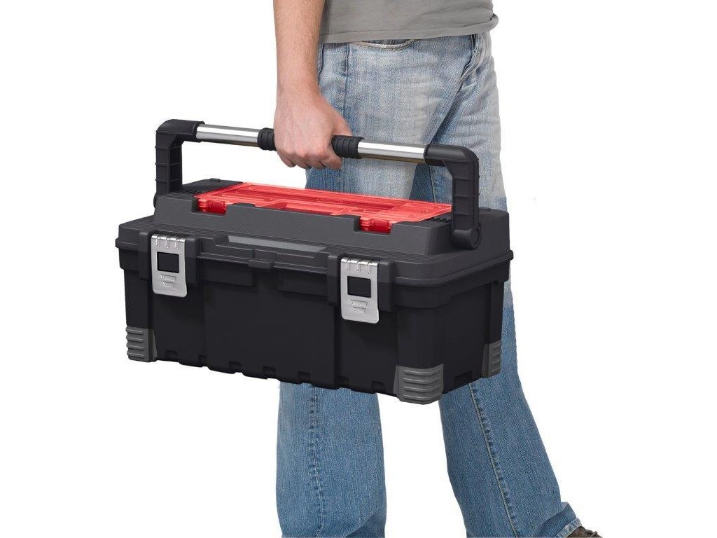 Gumové přepážky vám umožní přizpůsobit si vnitřní prostor boxu podle typu nářadí. Kovové západky a zajišťovací popruhy zajistí pevné uzavření kufru. V případě, že chcete mít přístup k nářadí jen vy, uzamkněte box klasickým visacím zámkem. Ten si ovšem musíte dokoupit zvlášť. Praktické madlo vám navíc zjednoduší jeho přenášení a manipulaci.
