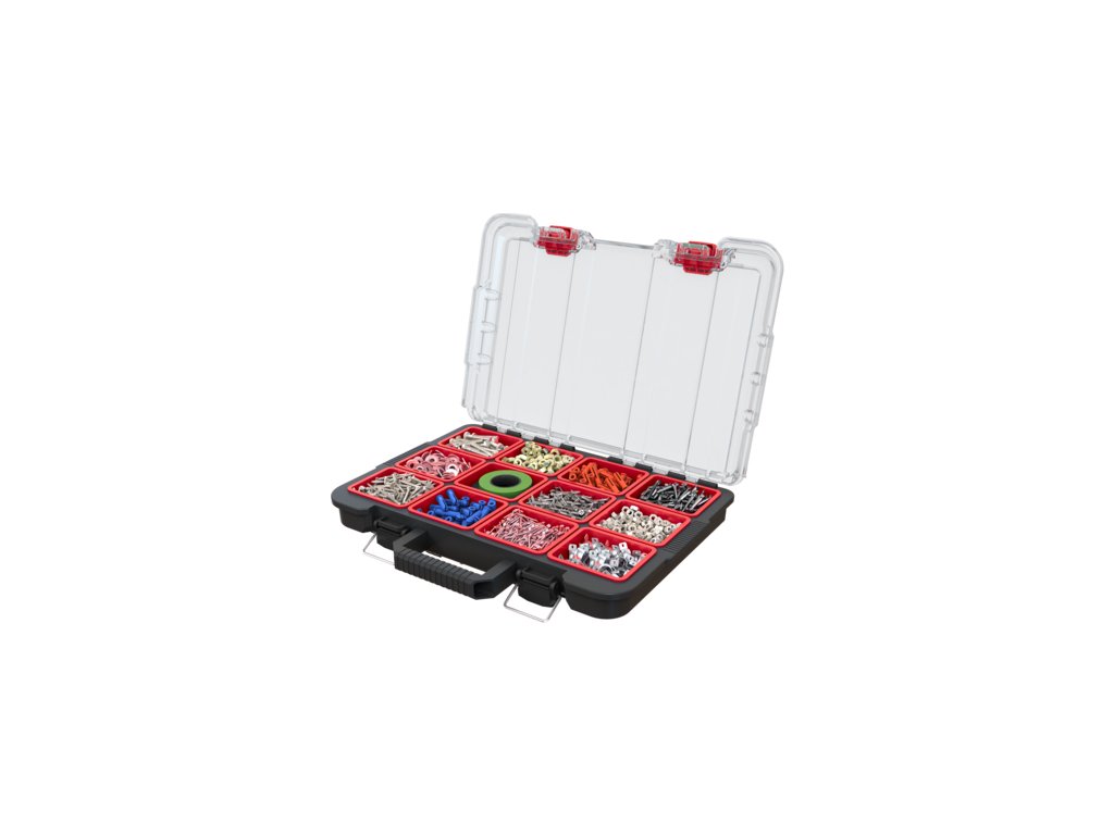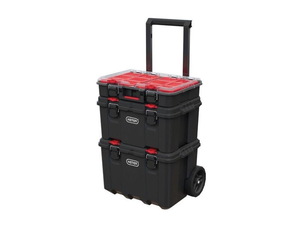 Využijte mobilní systém Keter s organizérem a vyjímatelnými boxy a uspořádejte do nich kromě velkého náčiní také šroubky, matice, vruty a další drobné pomůcky. Kovové západky zajistí pevné uzavření víka. Obsah boxů se vám tedy nevysype a zůstane v bezpečí. Teleskopické kovové madlo vám navíc zjednoduší manipulaci celého systému.