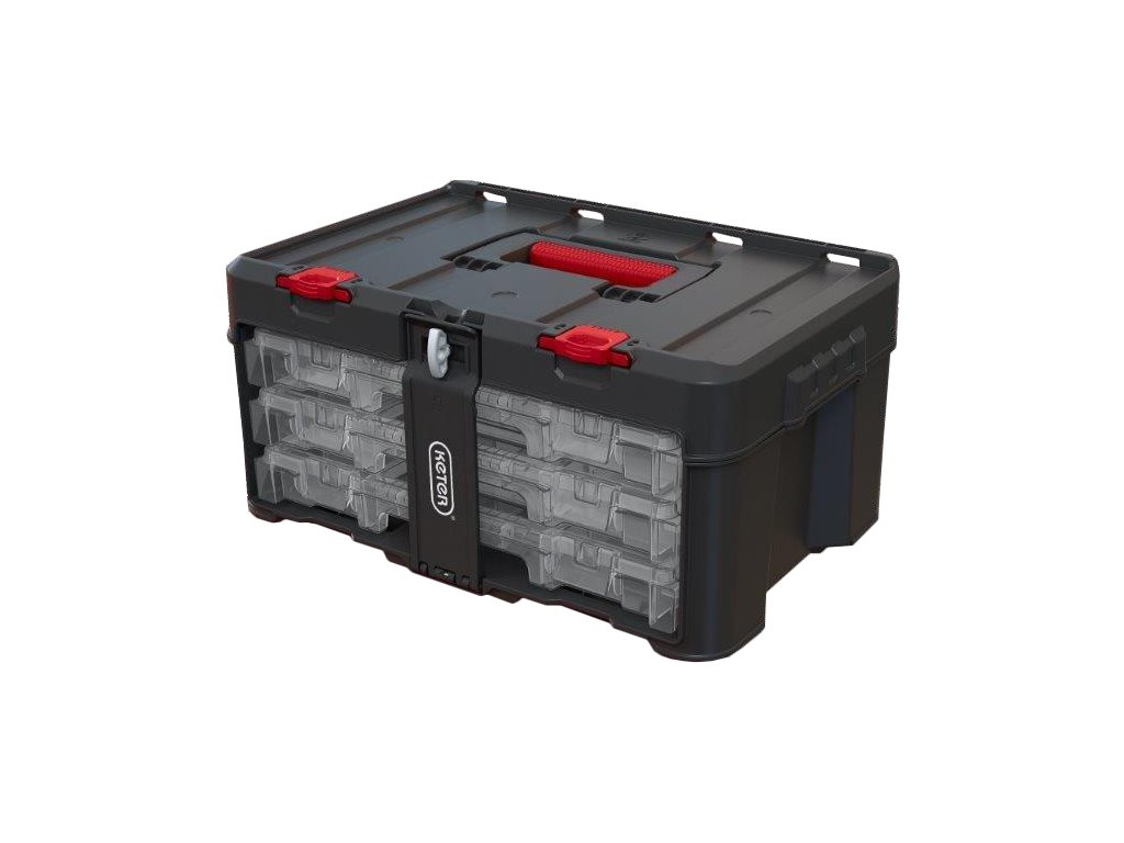 Polykarbonátová uzamykací lišta zajistí pevné uzavření boxu. Jeho obsah se vám tedy nevysype a zůstane v bezpečí. O upevnění organizérů se stará zaklapávací uzávěr. Ergonomická rukojeť a postranní úchyty vám navíc zjednoduší jeho přenášení.