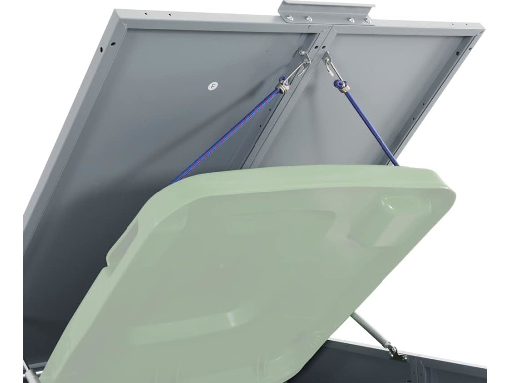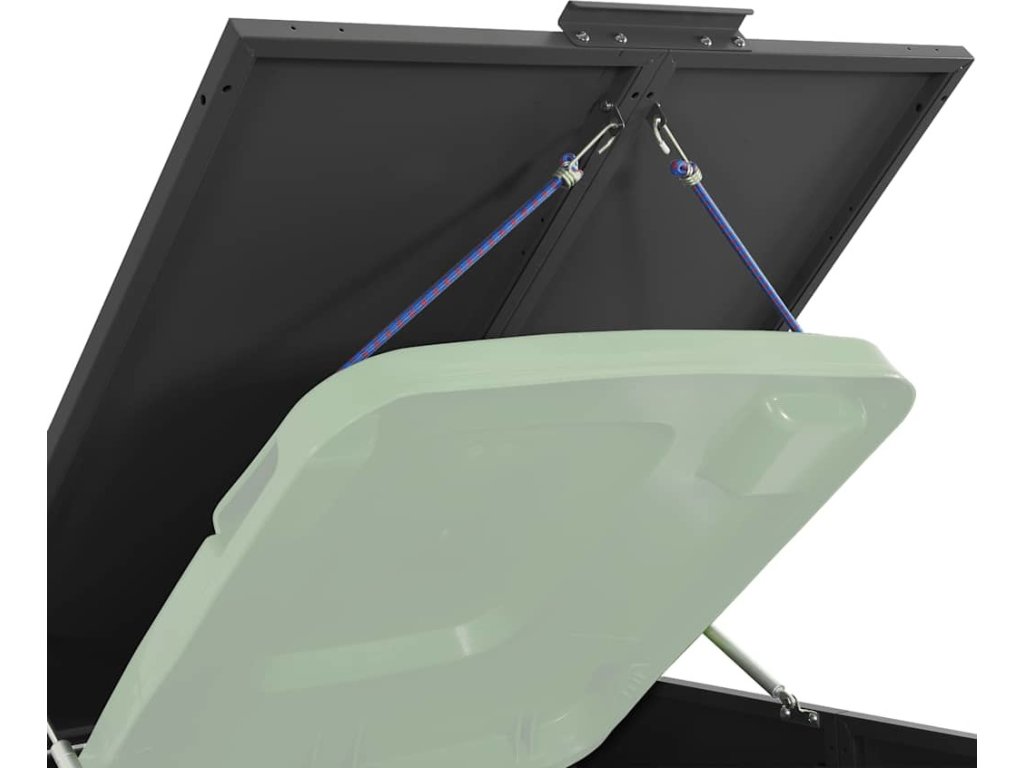 - Praktický mechanismus víka: Plynová pružina víka je opatřena gumovou šňůrou, která spojuje víko popelnice s víkem boxu, takže se víko popelnice automaticky otevře, když zvednete víko boxu.