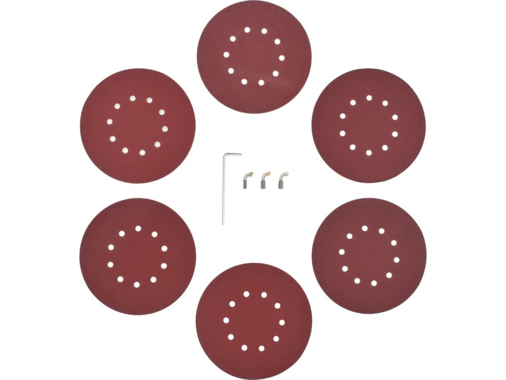Příslušenství obsahuje 6 brusných papírových disků (80, 100, 120, 150, 180, 240 zrna), 2 uhlíkové kartáče, 1 hadici na prach, 1 šestihranný klíč a 1 sáček na sběr prachu.