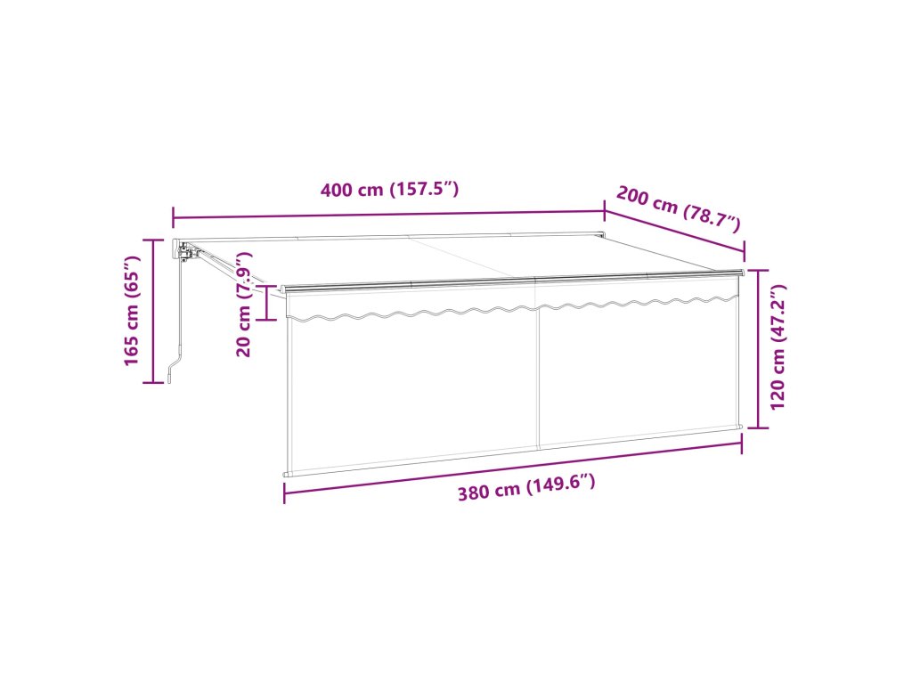 - Celkové rozměry: 400 x 200 x 165 cm (D x Š x V)
