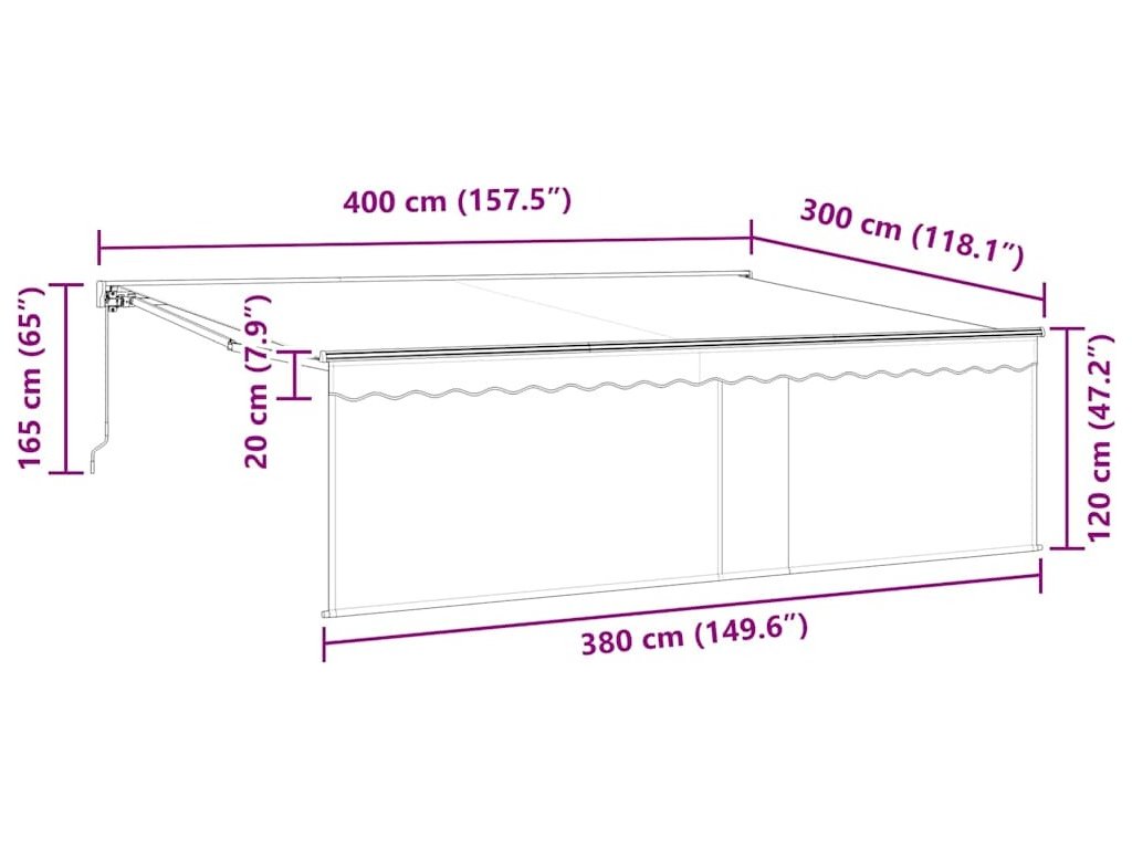 - Vlastnosti / Funkce / Design: Markýza je vybavená manuálním zatahovacím mechanismem, který dává možnost snadno nastavit stín. Díky odolnosti proti korozi se nemusíte bát o její poškození a barvy zůstanou svěží a živé po dlouhou dobu. Takže je to skvělá volba pro jakékoliv venkovní místo.
