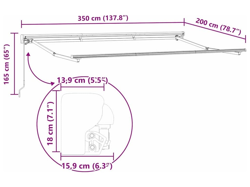 - Celkové rozměry: 350 x 200 x 165 cm (D x Š x V)