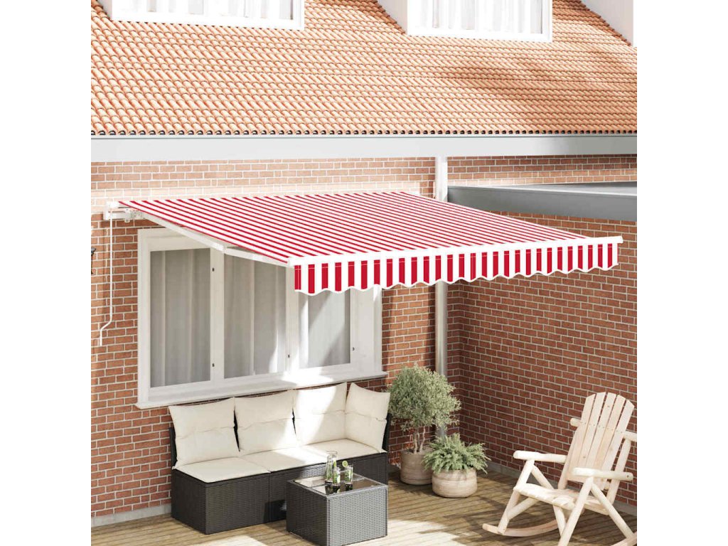 Tato moderní výsuvná markýza spojuje styl a funkčnost, ideální pro vaše venkovní prostory jako zahrady a terasy. Obdélníkový tvar o rozměrech 300 x 250 cm nabízí skvělý stín, který se hodí pro shromáždění nebo relaxaci. Díky jednoduchému a čistému designu se hodí do jakéhokoliv moderního prostředí s barevnými akcenty v červené a bílé, chrání před sluncem a zvyšuje vizuální přitažlivost vašich exteriérů.