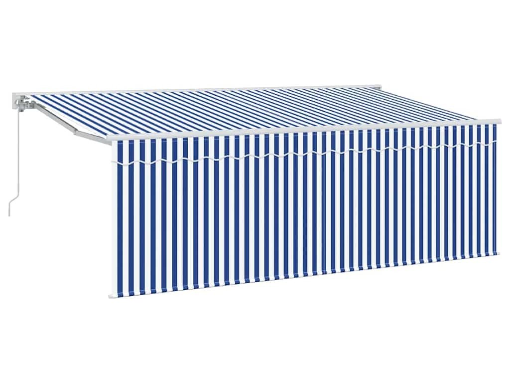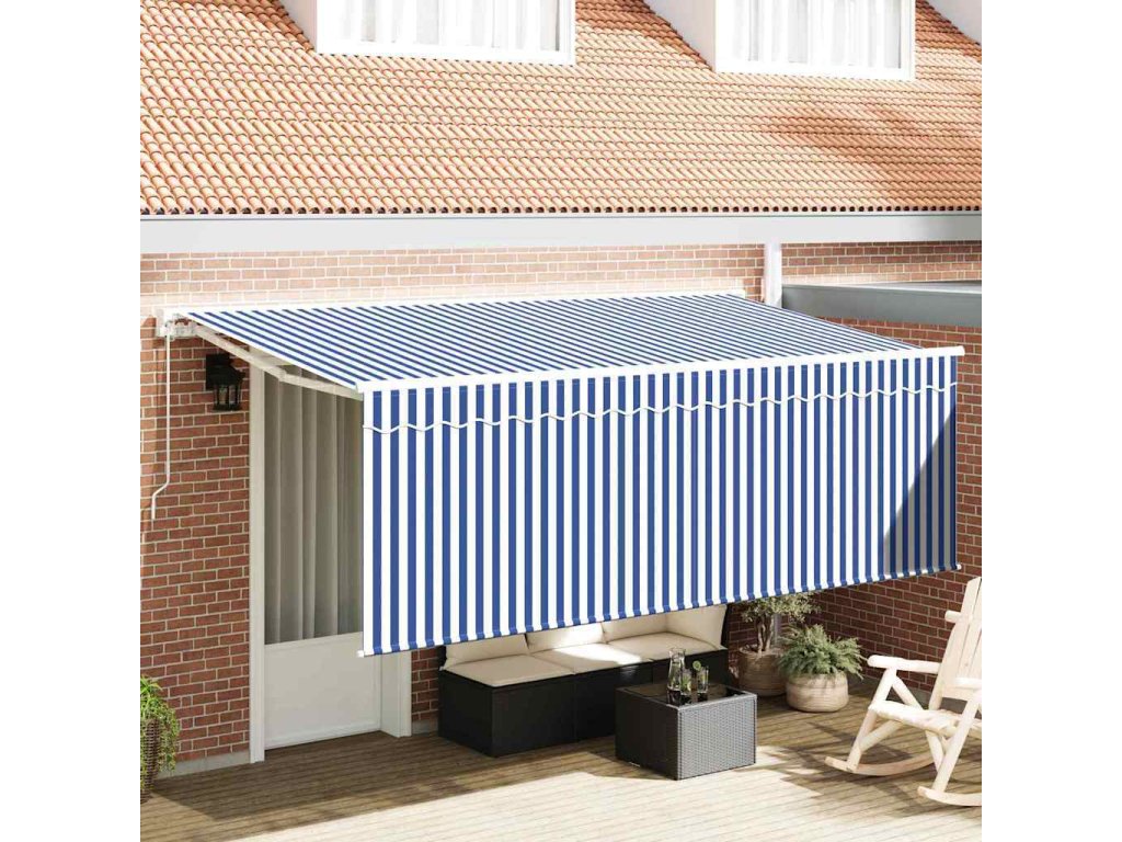 Obdélníková zasouvací sluneční markýza spojuje moderní vzhled s praktickými funkcemi. Je stylová a má modro-bílý pruhovaný design, který se hodí do zahrad nebo na terasy. Báječně chrání před sluncem během letních oslav a poskytuje příjemné místo pro setkání s rodinou a přáteli. Perfektně se hodí pro teplé dny, když potřebujete odpočinkový prostor.