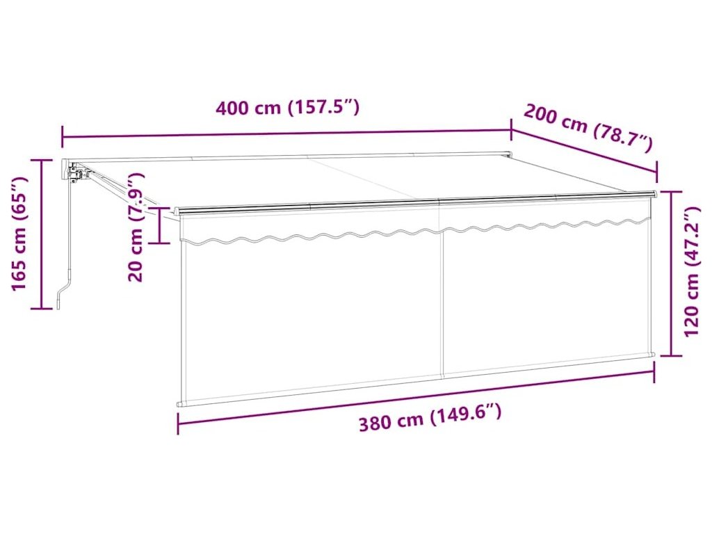 Tato moderní výsuvná markýza skvěle doplní jakýkoliv venkovní prostor a poskytne efektivní stín a šmrnc. Její elegantní obdélníkový design pokrývá plochu 400 x 200 cm, takže je ideální pro větší terasy nebo zahrady. Vytvořená pro styl a funkčnost, čisté linie se hodí k modernímu designu a dodávají elegantní prvek, který snadno ladí se současnou nebo minimalistickou architekturou. Skvěle se hodí na setkání, k poklidnému čtení nebo prostě k vychutnání čerstvého vzduchu pod chráněným baldachýnem.