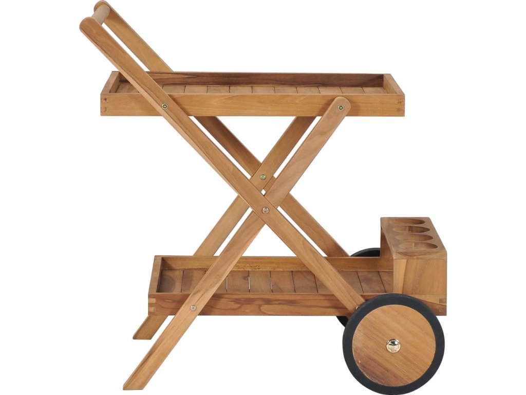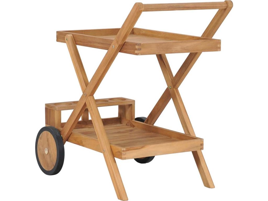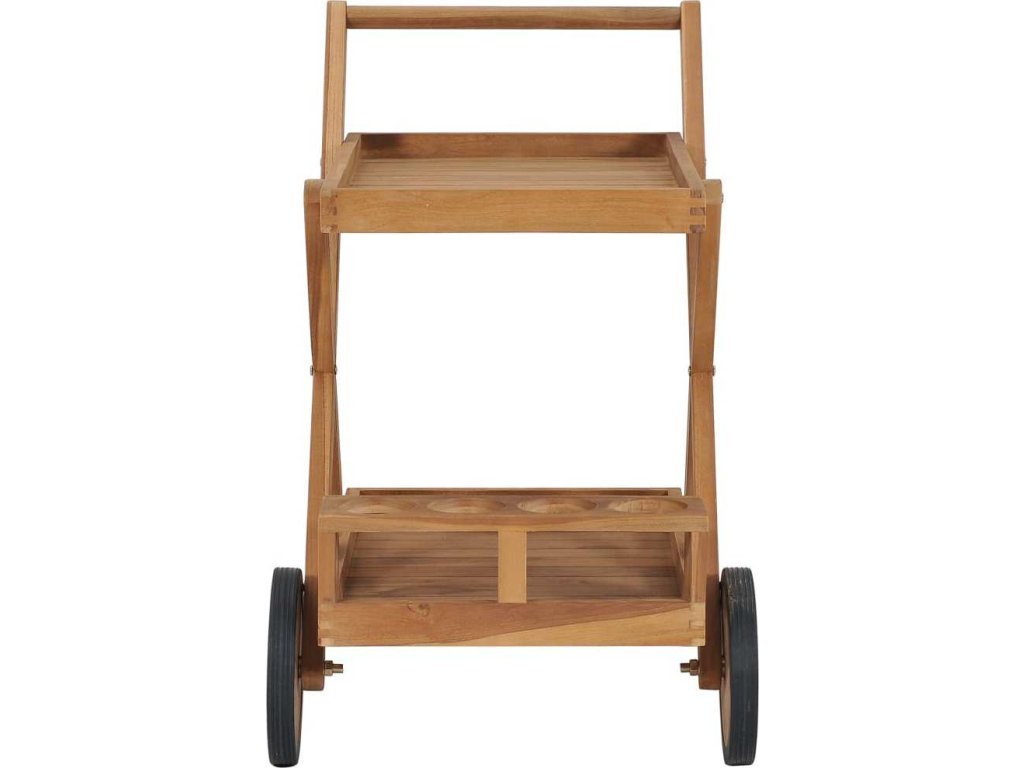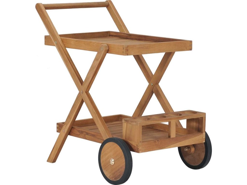 Tento teakový nábytek je zhotovený z extrémně odolného teakového tvrdého dřeva, které již prošlo procesem smršťování, bylo uměle vysušené a poté jemně a dohladka obroušené. Toto dřevo je oceňované pro svou výjimečnou pevnost a klimatickou odolnost, a proto je zdaleka nejvhodnějším materiálem pro výrobu zahradního nábytku. Jedná se o skvělou volbu, pokud si chcete pořídit zahradní vybavení, které vám vydrží sloužit dlouhá léta. Překrásný vozík má horní a spodní poličku, takže nabízí spoustu místa. Na druhé poličce navíc najdete i držák na skleničky, kam můžete bezpečně naskládat sklenice na víno či jiné skleněné nádobí. Servírovací vozík se dá snadno přesouvat z místa na místo, protože má kompaktní design a dobrou pohyblivost.