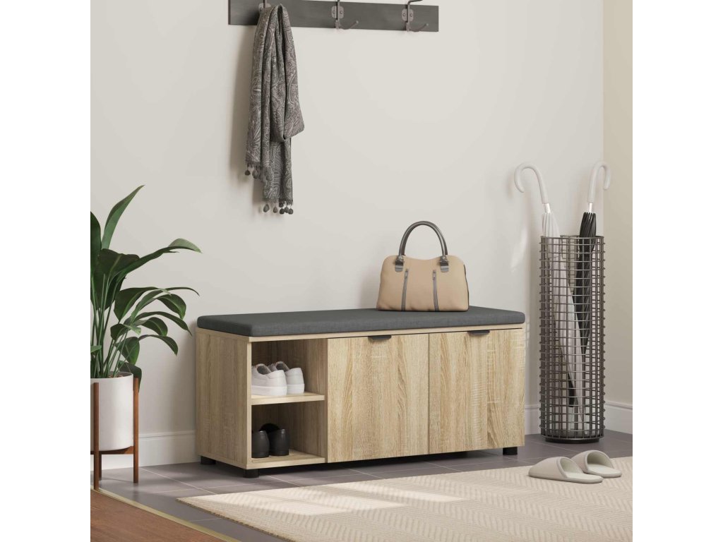 - Úložný prostor: Policové desky z inženýrského dřeva poskytují jednoduché a praktické úložiště. Ideální na uložení vašich bot nebo drobností, tyto police zvyšují praktickou hodnotu lavice, čímž ji dělají velmi univerzálním kouskem nábytku.