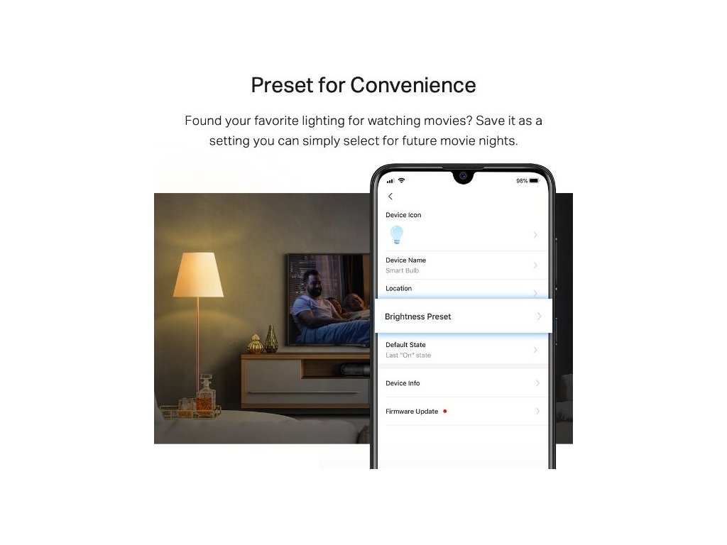 - Stmívání - pohodlné přednastavení - našli jste své oblíbené osvětlení pro sledování filmů? Uložte jej jako nastavení, které si můžete jednoduše vybrat pro budoucí filmové noci