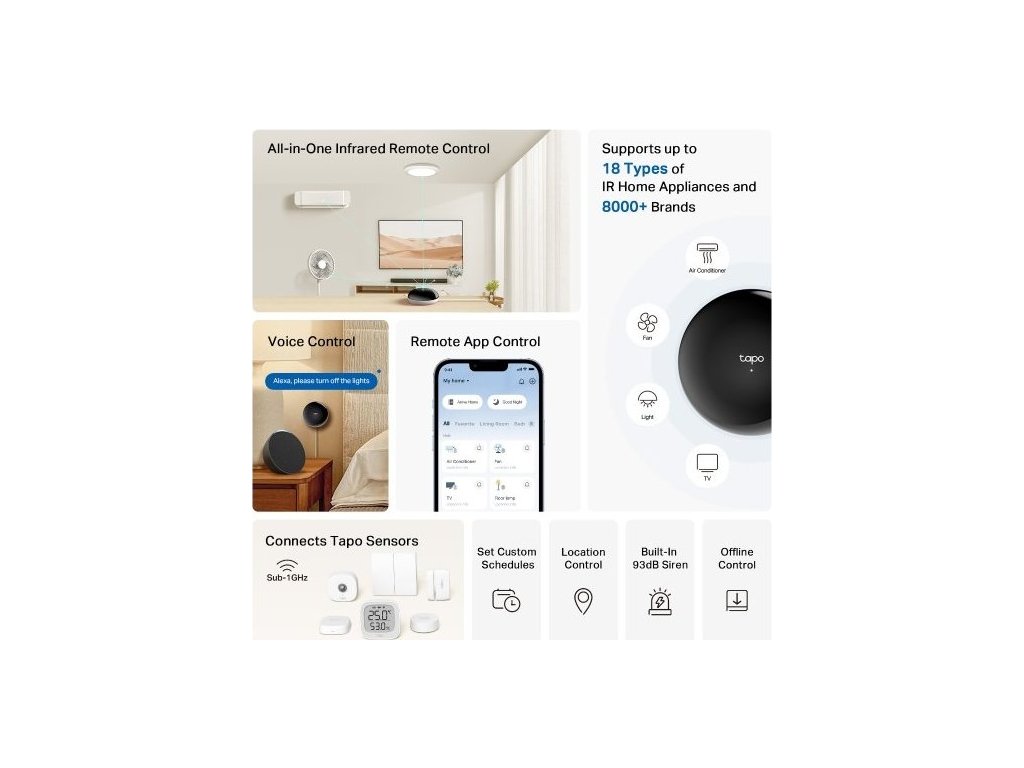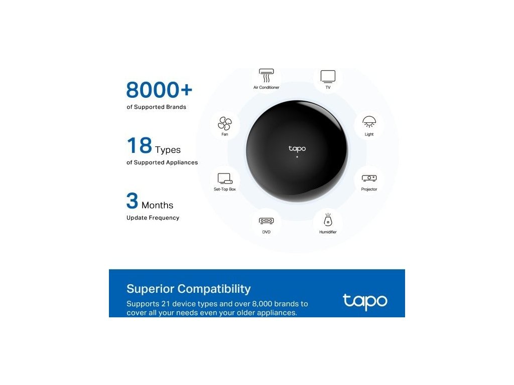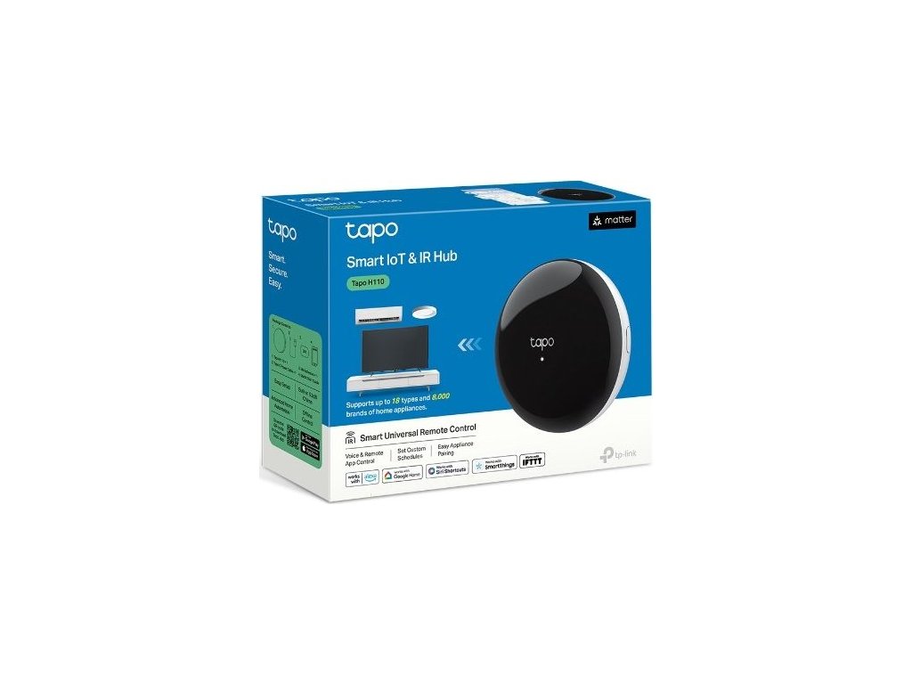 IoT hub TP-Link Tapo H110 vám zjednoduší správu vaší chytré domácnosti. Je kompatibilní s širokou škálou zařízení, které s ním propojíte. Podporuje 18 typů zařízení a více než 8 000 značek. Kromě toho dochází každé 3 měsíce k postupné aktualizaci databáze a kompatibilita hubu se tím rozšiřuje o nové modely. Spolupracuje s chytrými zařízeními Tapo (například kamery a senzory).