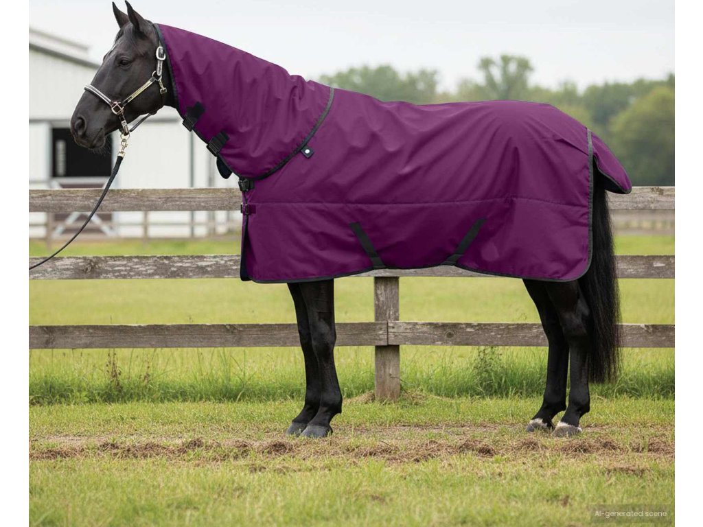 - Vysokokvalitní polyester: Deka se vyrábí z vodotěsného polyesteru, což zajišťuje spolehlivou ochranu před deštěm a sněhem. Tento odolný materiál vydrží extrémy počasí, poskytuje teplo a udržuje koně v suchu, čímž majiteli dodává klid. Můžete ji prát v pračce, což usnadňuje údržbu a zaručuje dlouhou životnost bez ztráty vzhledu nebo funkčnosti.