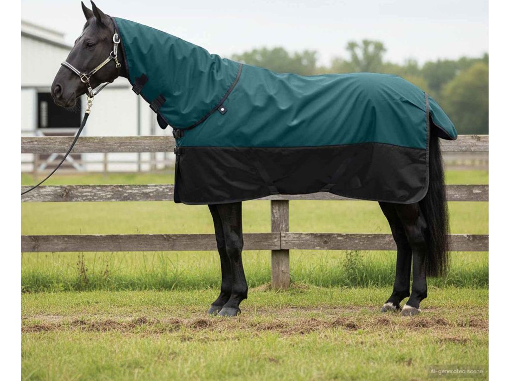 - Vysokokvalitní polyester: Deka se vyrábí z vodotěsného polyesteru, což zajišťuje spolehlivou ochranu před deštěm a sněhem. Tento odolný materiál vydrží extrémy počasí, poskytuje teplo a udržuje koně v suchu, čímž majiteli dodává klid. Můžete ji prát v pračce, což usnadňuje údržbu a zaručuje dlouhou životnost bez ztráty vzhledu nebo funkčnosti.