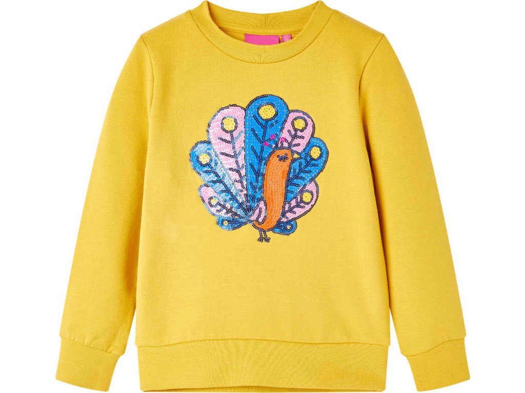 Tato dětská mikina má dlouhé rukávy, kulatý výstřih a žebrované okraje na manžetách, výstřihu a spodní části. Dětská mikina má na sobě třpytivého flitrového páva. Mikina je vyrobena z 95 % z bavlny a 5 % z elastanu, takže jsou velmi pohodlná a prodyšná.
