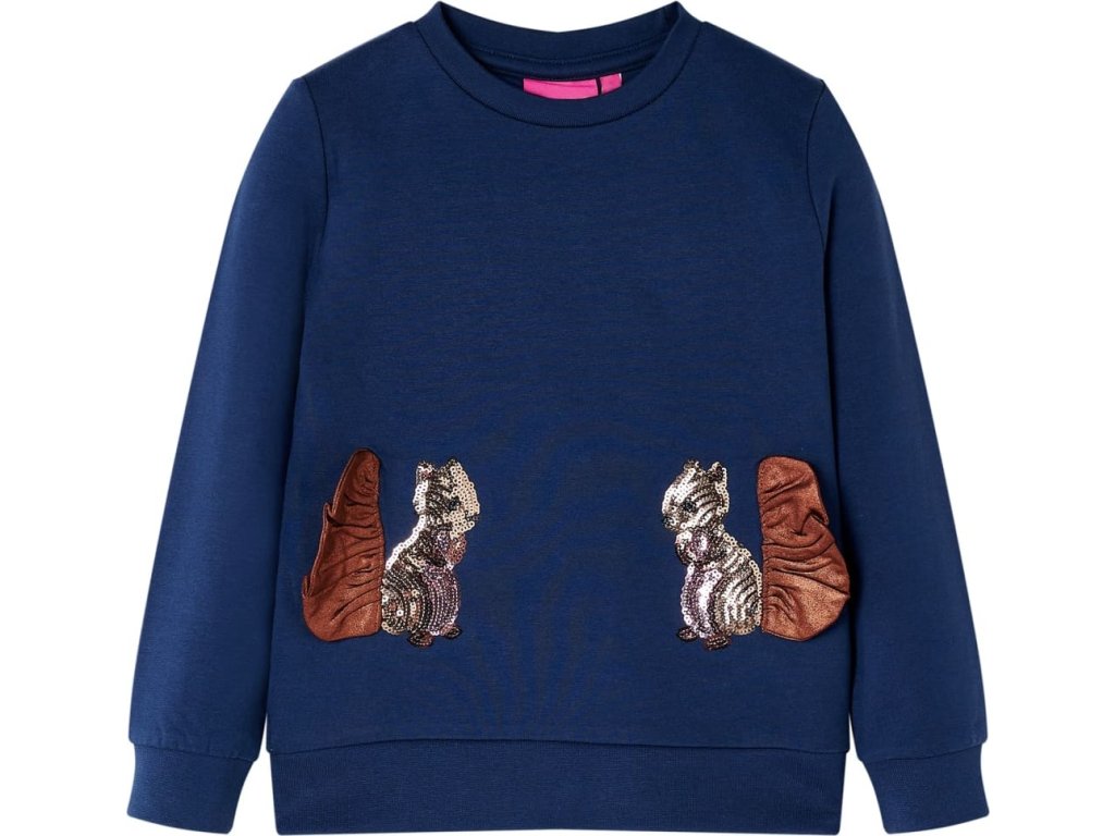 Tato dětská mikina má dlouhé rukávy, kulatý výstřih a žebrované okraje na manžetách, výstřihu a spodní části. Dětská mikina má krásnou námořnickou barvu se dvěma flitrovanými veverkami, které jí dodávají na hravosti. Mikina je vyrobena z 95 % z bavlny a 5 % z elastanu, takže jsou velmi pohodlná a prodyšná. Má měkkou fleecovou podšívku, takže je velmi teplá.